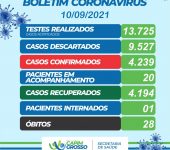 A Secretaria Municipal de Saúde, por meio da Vigilância Epidemiológica, informa que, hoje, 10 de setembro de 2021, nenhuma pessoa está devidamente recuperada da Covid-19. Foi notificado e confirmado 01…